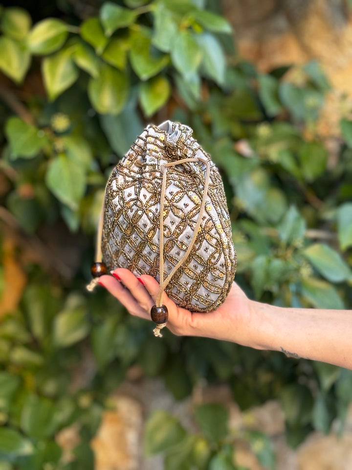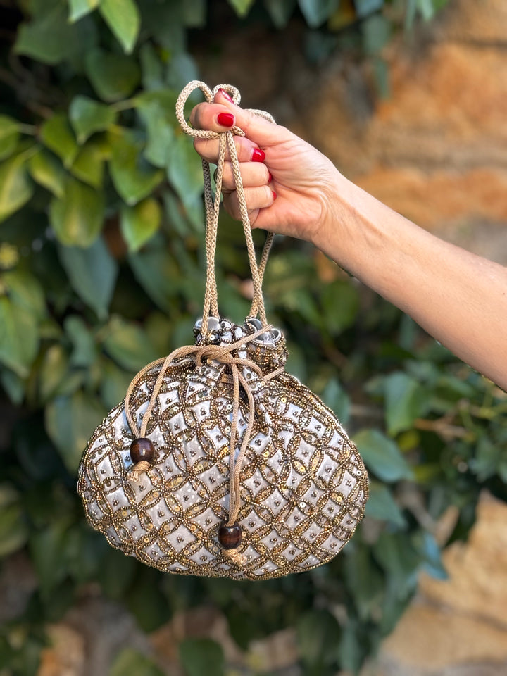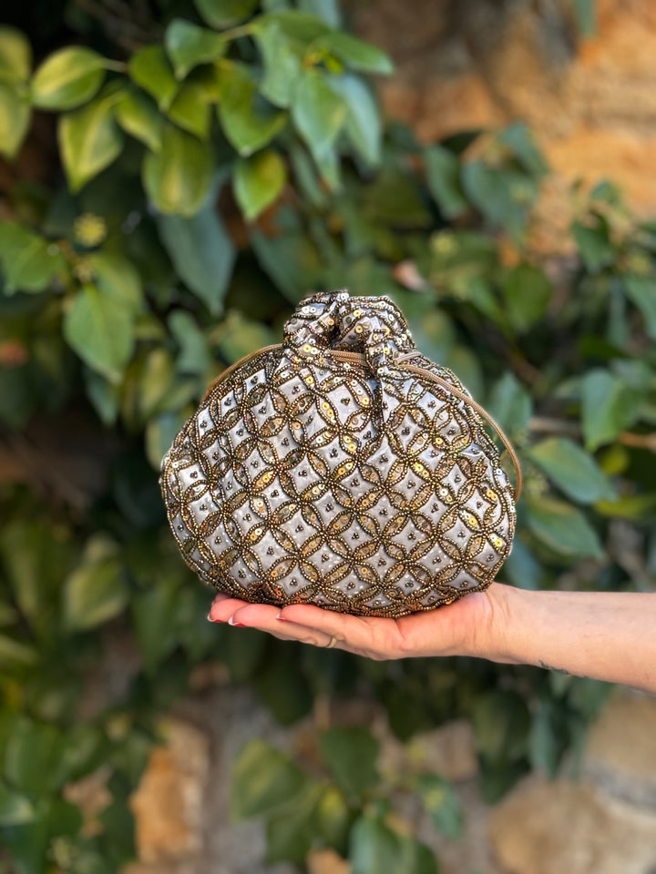 Cartera/bombonera de tejido redonda, en tono gris perla y bordada con lentejuelas color dorado. Cierre rustico con bolas de madera y diseño atemporal, que combina con todo. Incluye cadena de hilo en el interior.