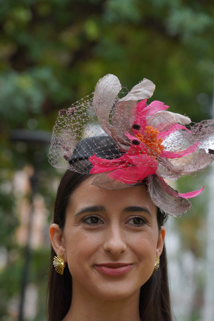 El tocado Mary es una pieza atrevida y con mucha personalidad. Su diseño combina pétalos en tonos fucsia y tierra con un centro en color caldera que aporta contraste y fuerza. La redecilla ligera añade un toque clásico que equilibra su aire moderno. Perfecto para invitadas que quieren destacar con estilo y elegancia.