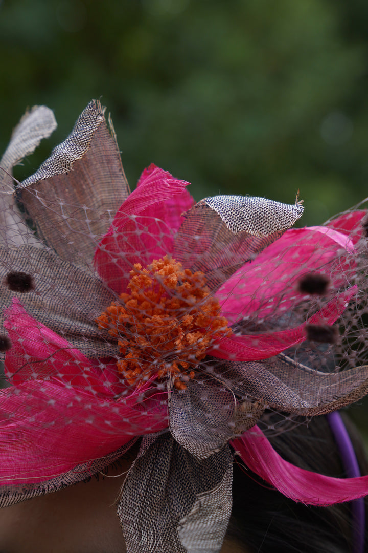 Confeccionada con flor de sinamay de seda con flor preservada y redecilla
