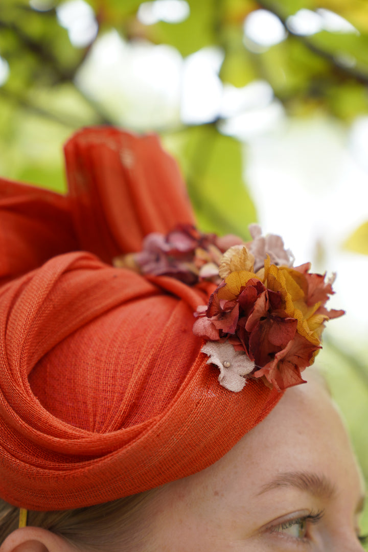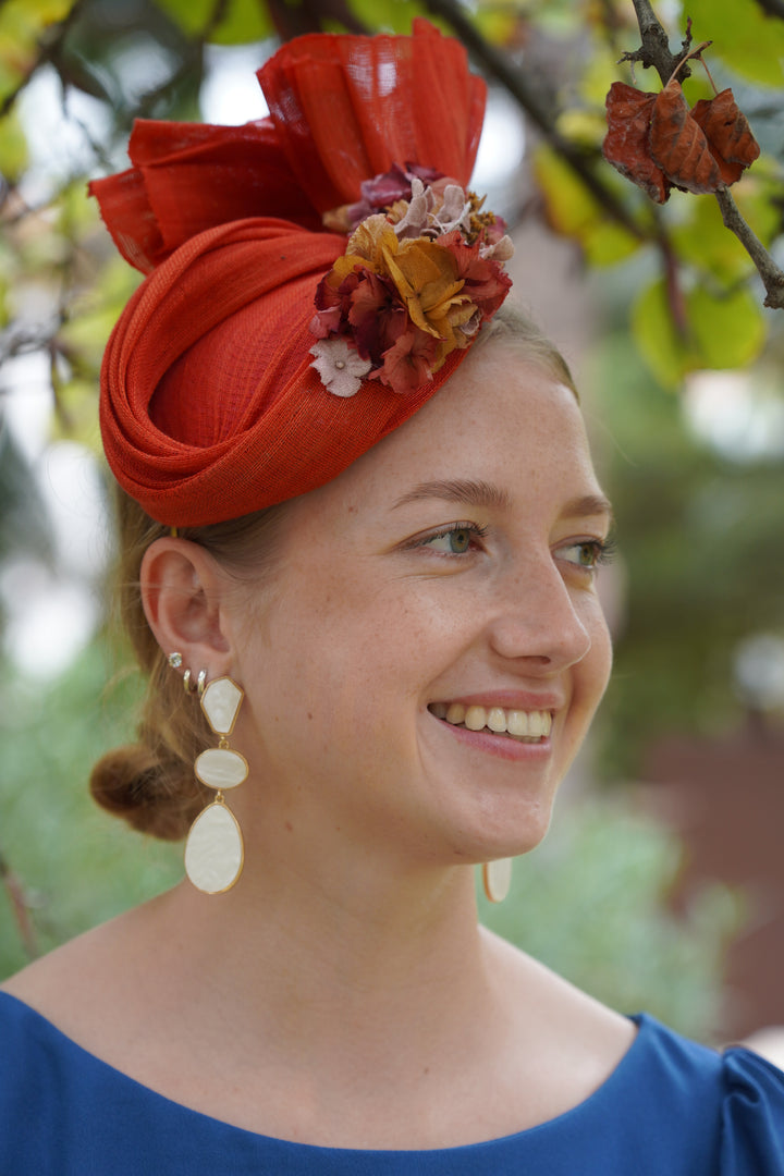 Tocado de sinamay de seda con flores de terciopelo y flores preservadas.