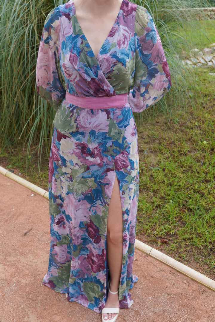El vestido Diva destaca por su delicado estampado floral y su silueta fluida, perfecta para eventos de día. Su escote cruzado y el corte en la cintura estilizan la figura, mientras que la abertura delantera aporta un toque elegante y femenino. Las mangas abullonadas y el cinturón en contraste realzan su encanto romántico.